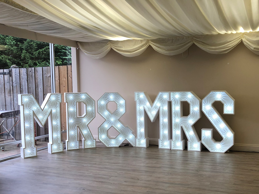 These classic white light up letters can spell out MR&MR, MR&MRS or MRS&MRS to hire for your wedding. These look super setup near your dancefloor fitted with starlight bulbs creating a romantic glow.