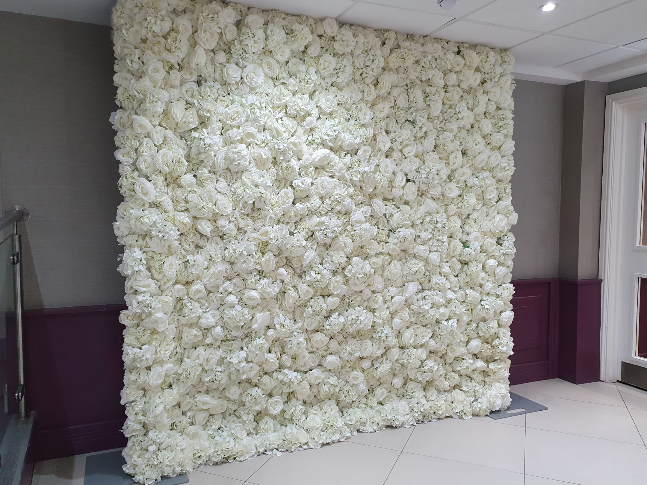 Each flower wall measures 2.4m x 2.4m. Our walls are made from a selection of high quality faux flowers and foliage to give a 3D full effect with no gaps.