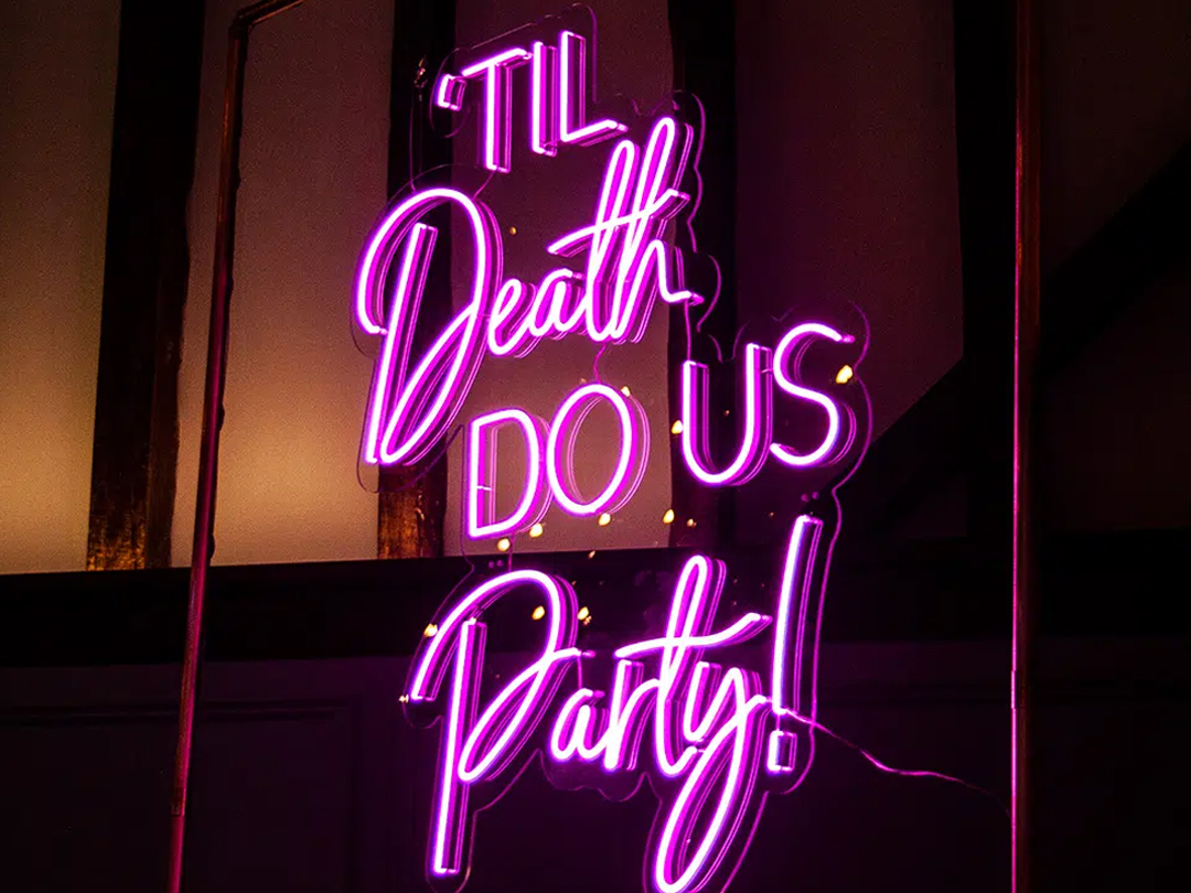 Our bright pink ‘Til Death Do Us Party Neon Sign on a clear perspex background hanging from a copper or black pipe frame.